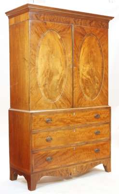 the projected moulded cornice over a plain frieze above crossbanded oval panelled doors and three graduated long drawers with shaped apron, raised on bracket feet