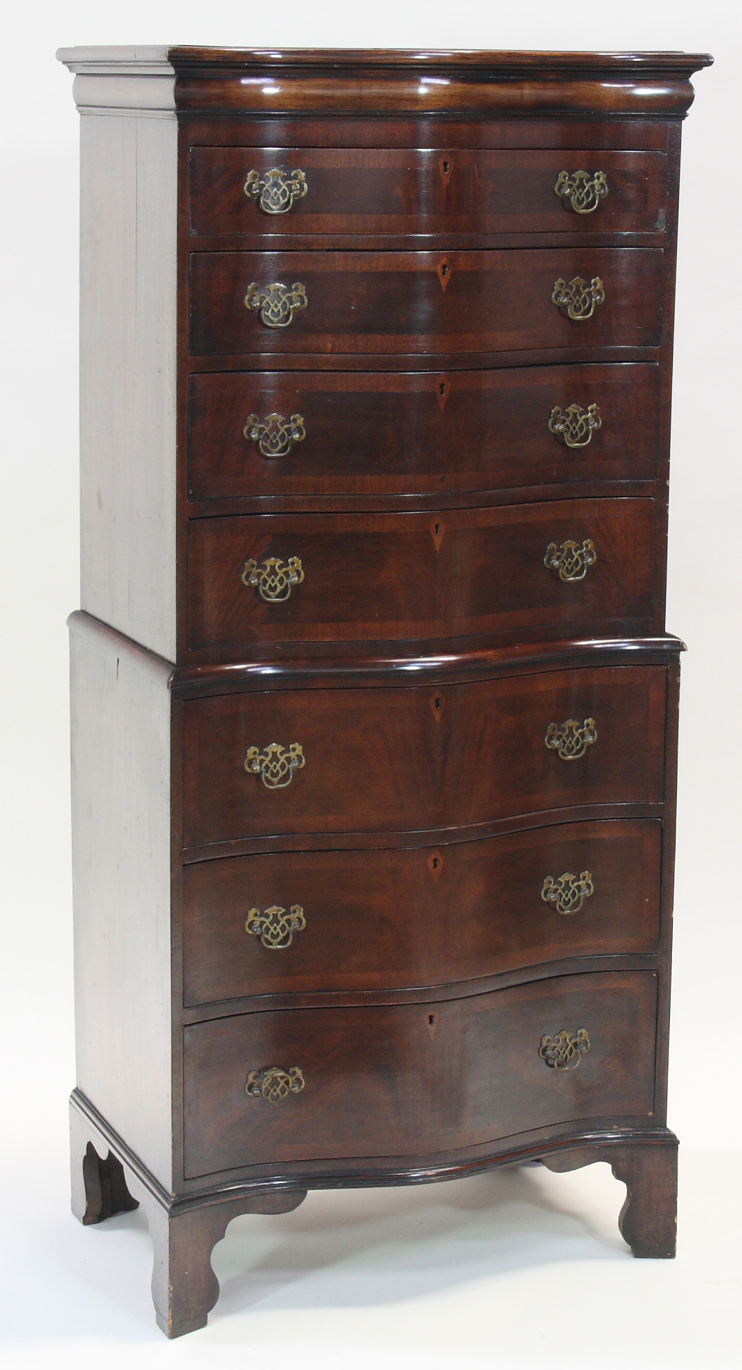 A Georgian style walnut serpentine chest on chest
