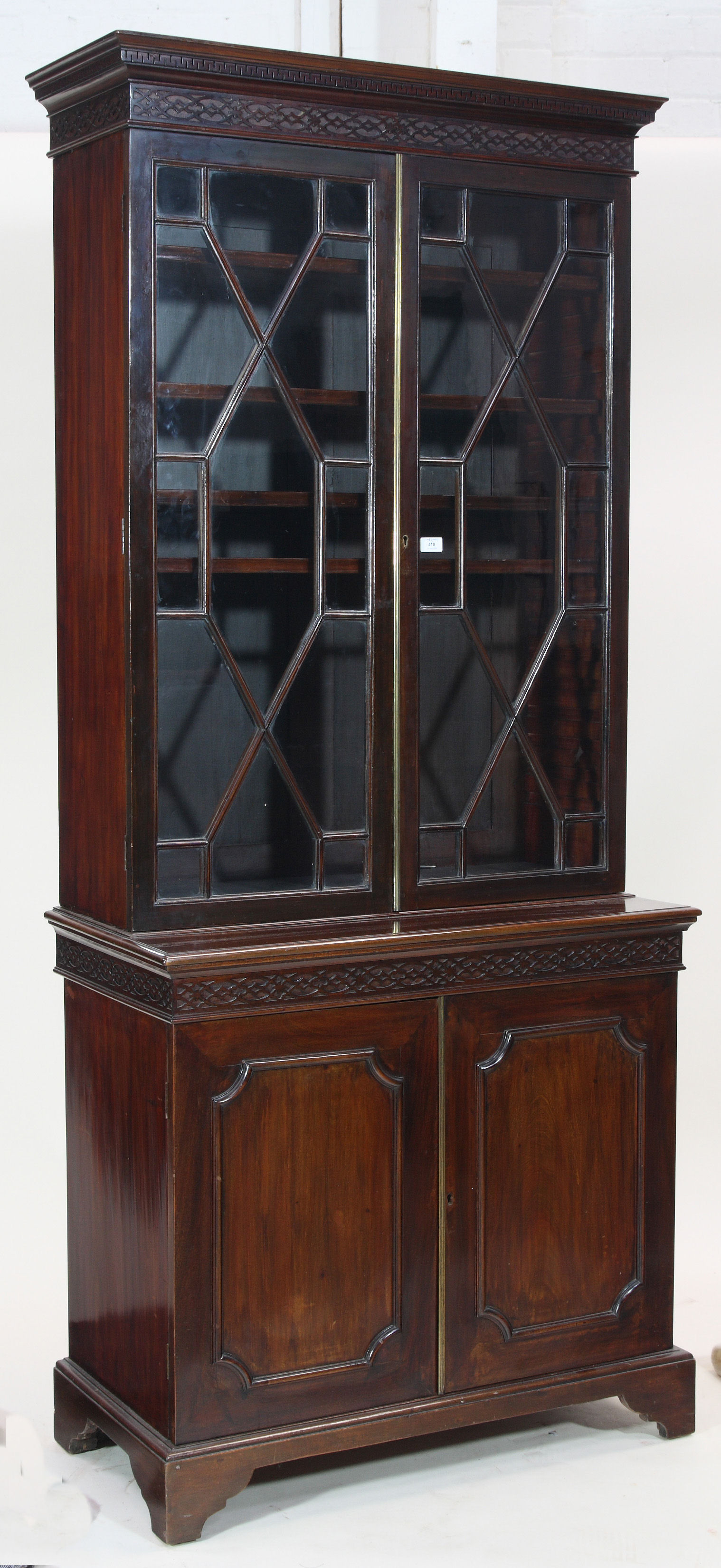 the projected moulded greek key cornice, over a closed fretwork frieze panel, the two astragal glazed doors enclosing shelves, the moulded cabinet top over closed fretwork frieze above panelled doors, raised on bracket feet
