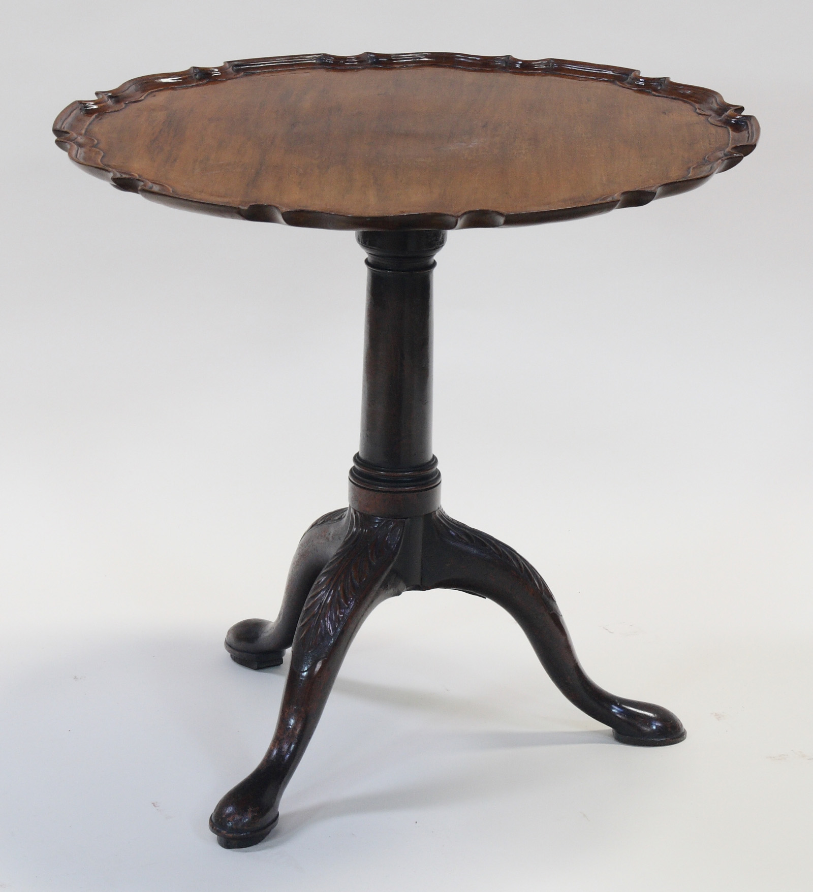 the moulded pie crust top on a tapering turned column with acanthus carved cabriole legs terminating in pad feet