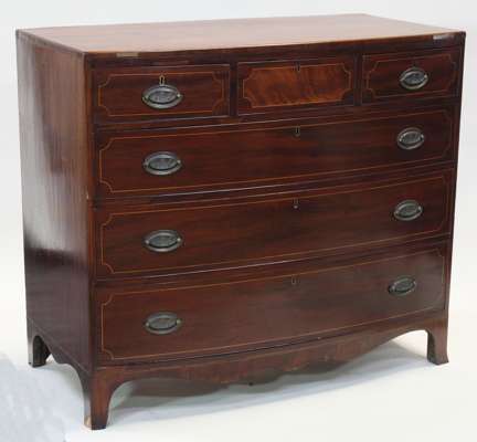 with three short over three boxwood strung graduated long drawers with shaped apron, raised on splayed bracket feet