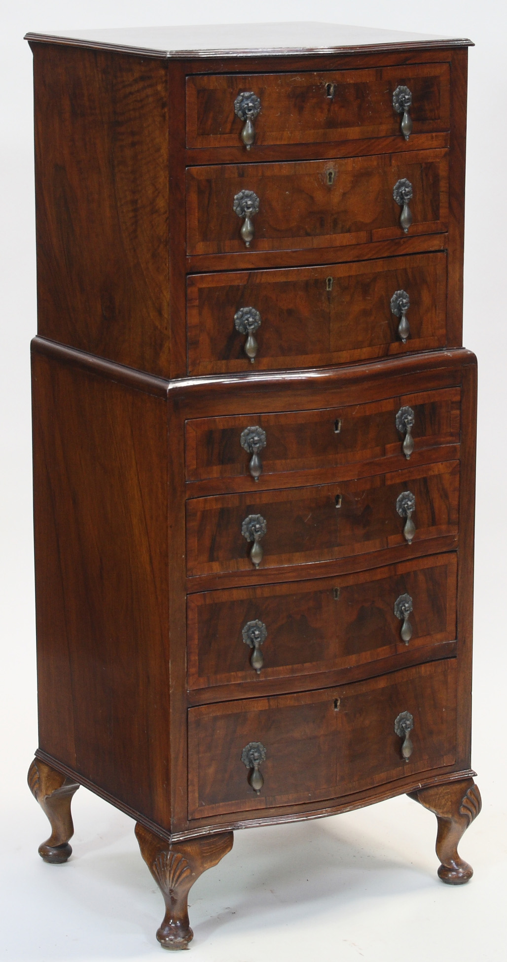 the moulded top over seven graduated drawers raised on squat shell carved cabriole legs terminating in pad feet