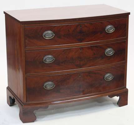 the crossbanded top over three cockbeaded graduated long drawers, raised on bracket feet
