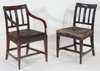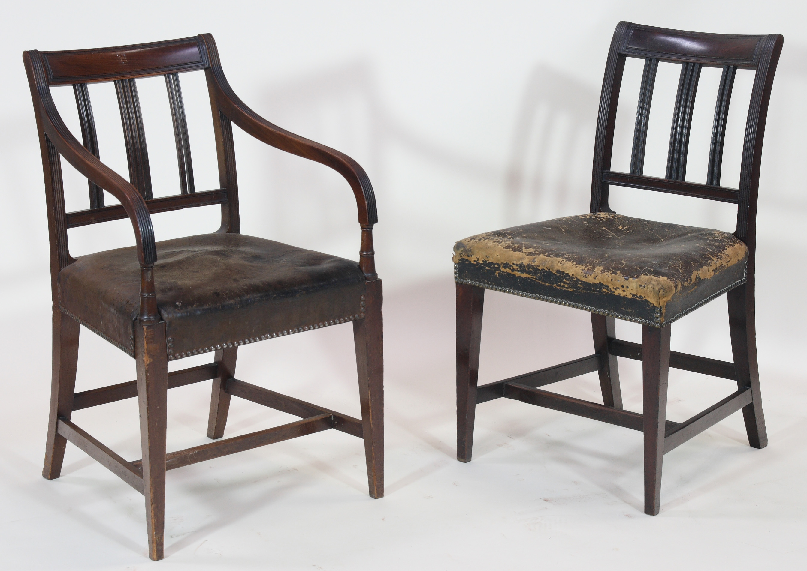 each with panelled top rail over reeded supports with vertical splats, the stuff-over seat above square tapering legs united by stretcher, including two carvers(12)