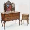 the rectangular crossbanded moulded top over two short and one long drawer with cabriole legs and shaped pad feet, 99cm 80cm wide, 49cm deep; including a similar bedside cabinet , with three drawers and cabriole legs terminating in pad feet 39cm wide, 64cm high, 32cm deep; and a matching triptych dressing mirror, 74cm wide (3)