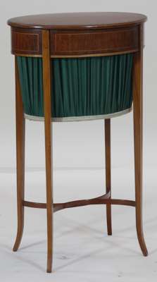 the rosewood crossbanded oval top over a boxwood strung frieze panel with green basket raised on square tapering legs with splayed feet, united by stretchers