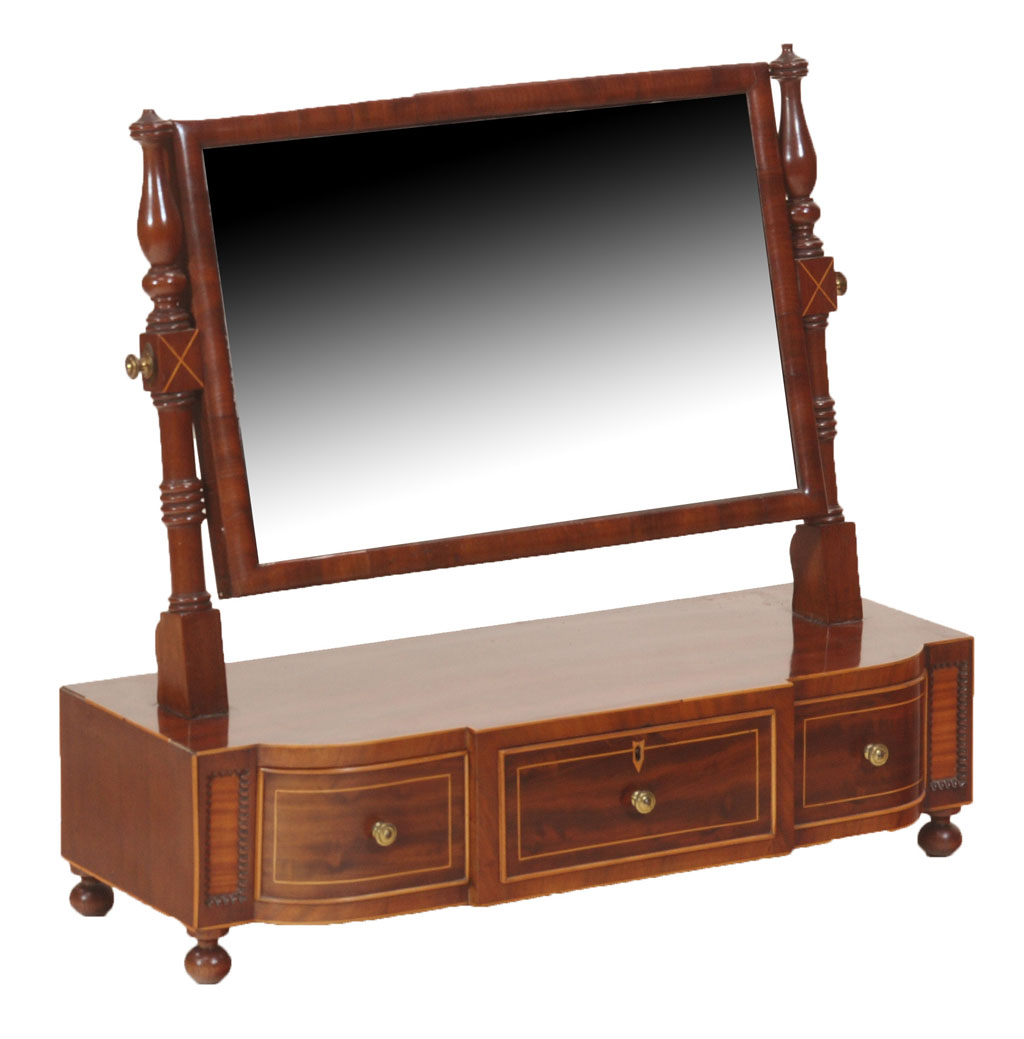 the rectangular mirrored plate raised on baluster turned supports over breakfront frieze with three boxwood strung drawers raised on bun feet