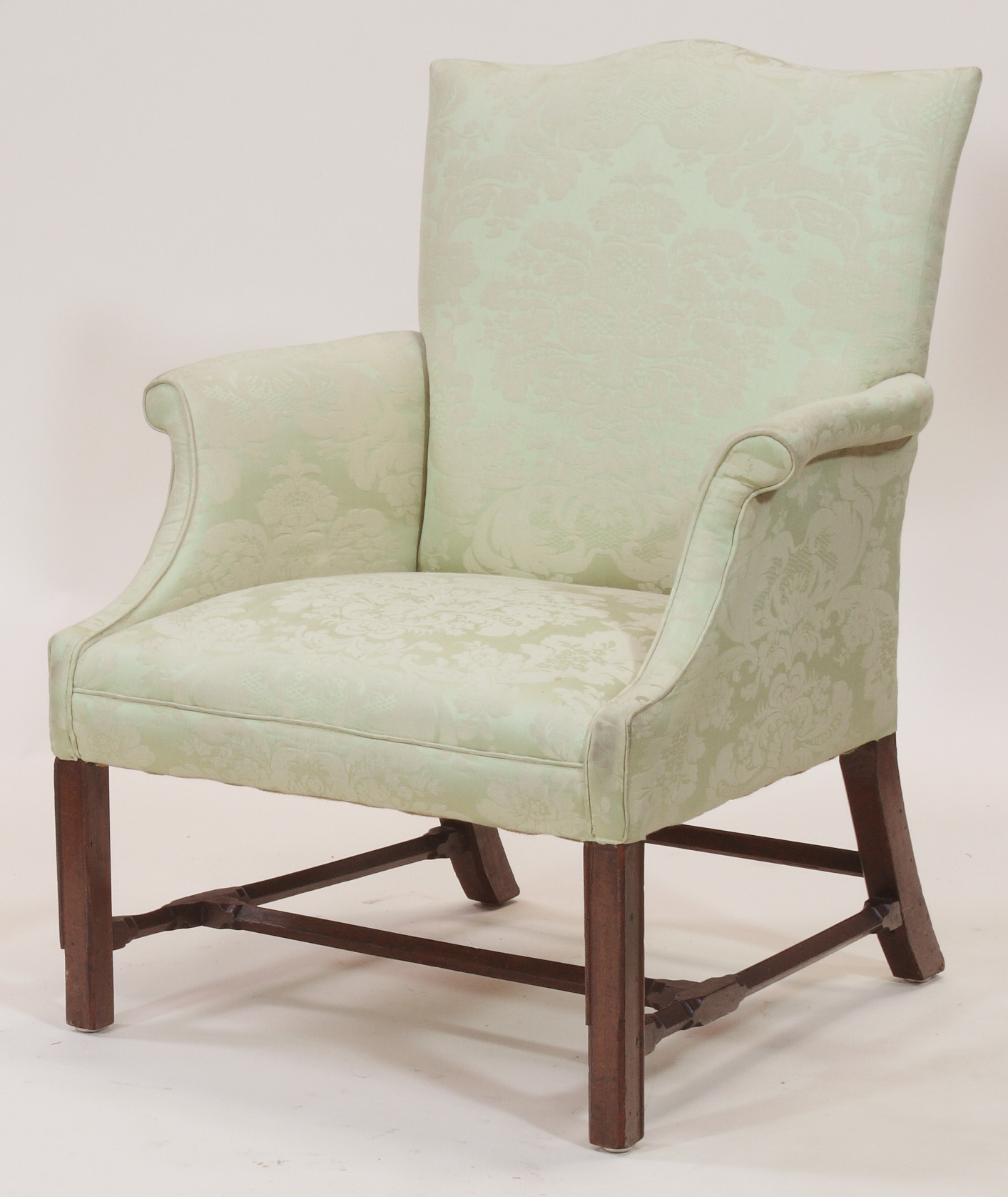 the serpentine top-rail over scroll arms with cushioned seat raised on square legs united by chamfered stretchers