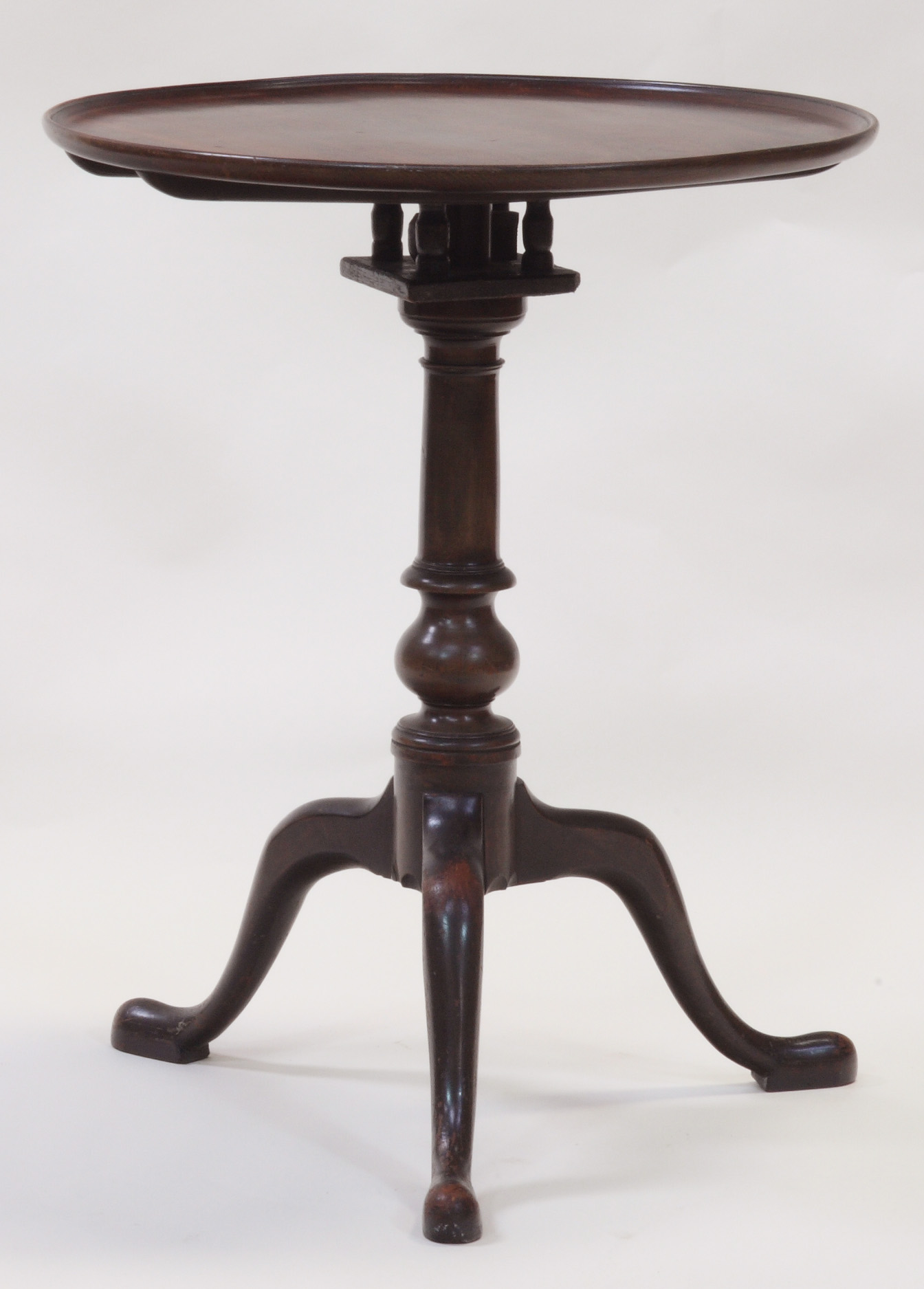 the circular top over a tapering baluster turned support with tripod cabriole legs and pad feet