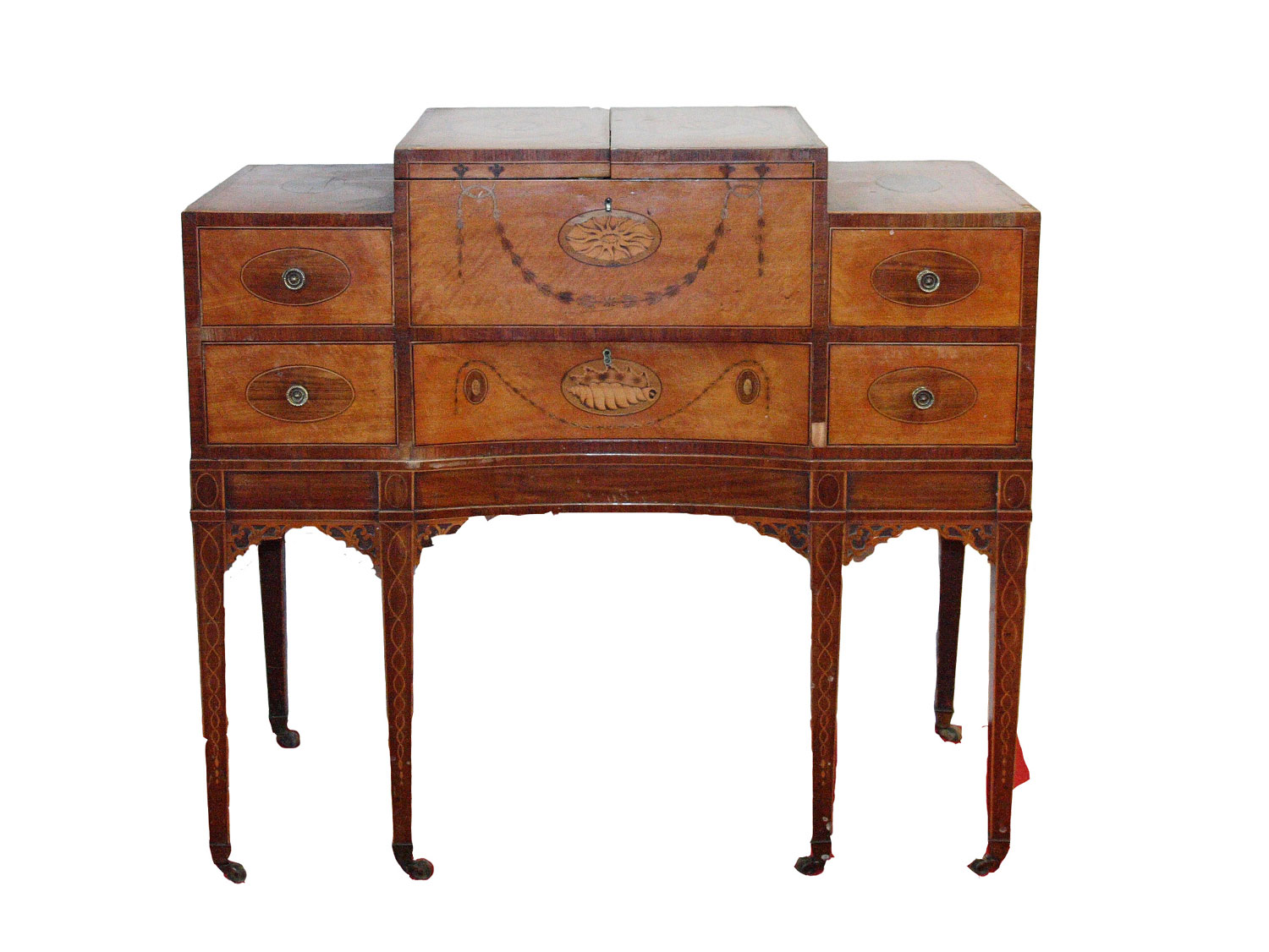 of stepped outline inlaid with stringing, husks and rosewood and shell ovals, the divided hinged top revealing a compartmented interior with rising rear mirror, above a concave drawer flanked by four short drawers, on square tapered mahogany legs ending in brass caps and castors