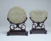of carp on a hardwood stand, 8cm high; another jade plaque of a butterfly, 6cm high; a jade plaque of a pair of bats, on a hardwood stand, 7cm high; and a jade bowl, 16cm wide (4)