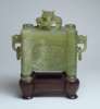 with dragon finial to cover, the box with column corners flanked by lion head handles, 12.5cm high; and a green jade vase and cover with dragon handle in a fitted hardwood frame, 15cm high (2)