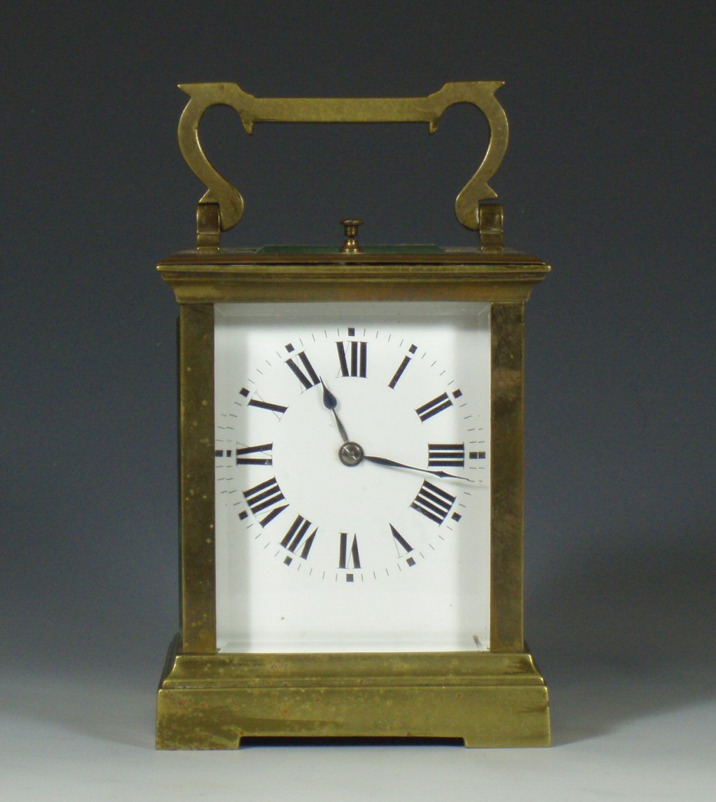 with lever escapement and repeater button, striking on a coiled gong, the white enamel dial with roman numerals, the case surmounted by a handle with bevelled glass panels