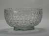 of circular form with scalloped rim and star cut base, 25cm diameter; three cut and frosted glass piggins and a similar basket; three rummers; and a later footed dish (9)