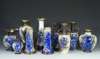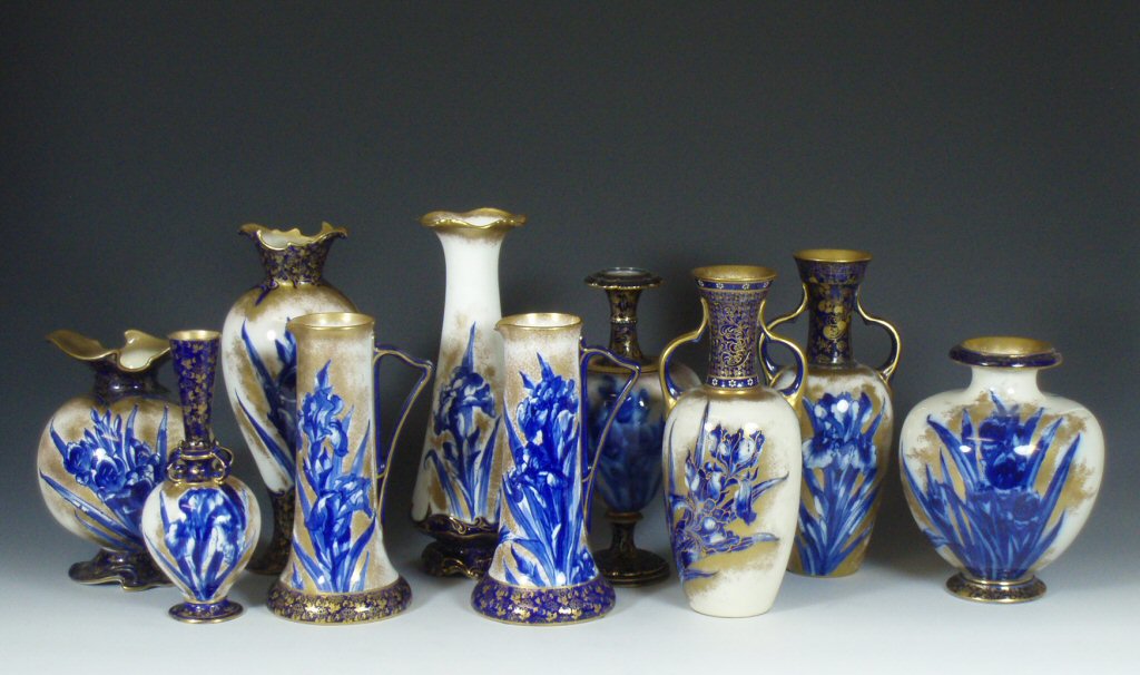 of assorted shapes and sizes, decorated with irises on a blue and gilt ground; and two ewers with similar decoration (10)