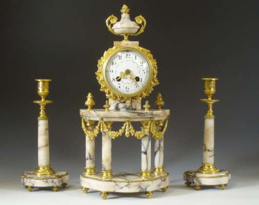 A late 19th century French gilt metal and marble clock garniture In the Empire style