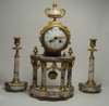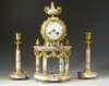 with cylinder movement, striking on a bell, the clock surmounted by an urn shaped finial over four columns, the circular white enamel dial with painted floral motifs and black arabic numerals, 40cm high; with similar candlesticks, 24cm high (3)