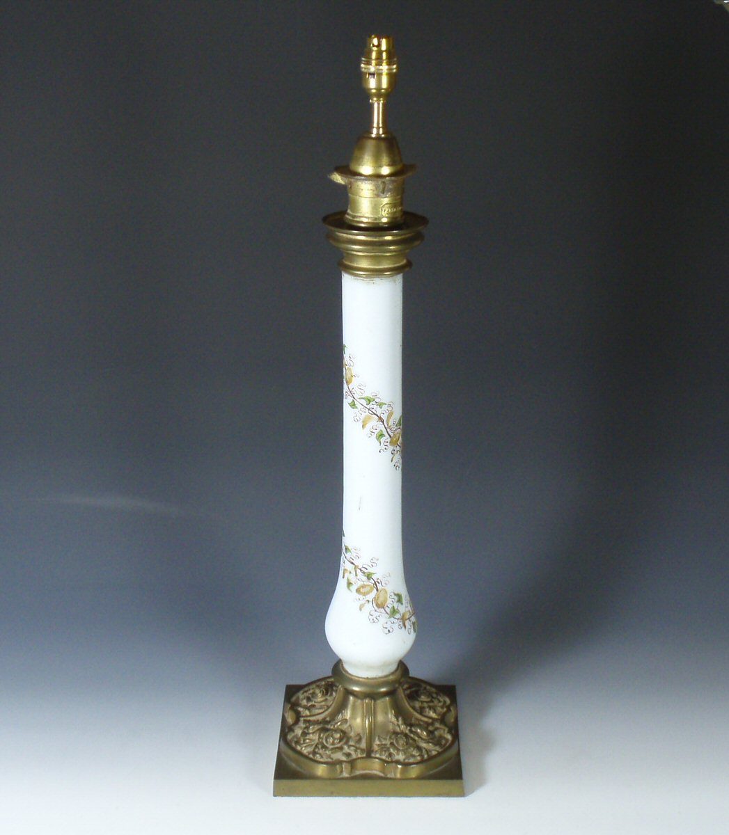 the white opaline glass column decorated with a painted spiral of convolvulus over a brass square base embellished with flowers, converted to electricity