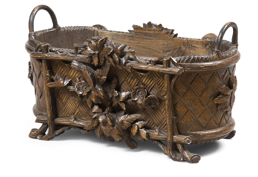 the oval basket of carved wickerwork form with applied leaf sprays, birds and flowers