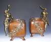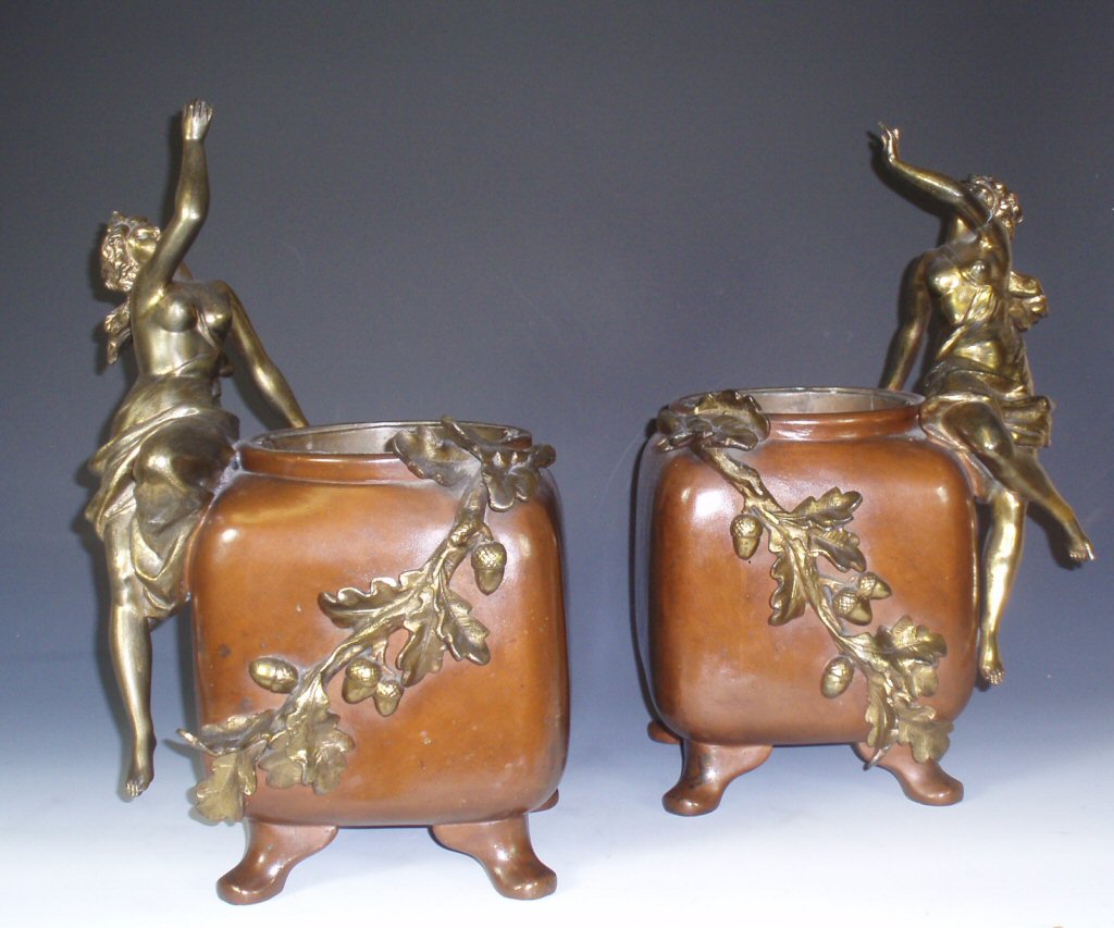 each with bronzed square section, flanked by a gilt figure and with a diagonal frieze of oak leaves and acorns (2)
