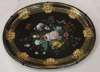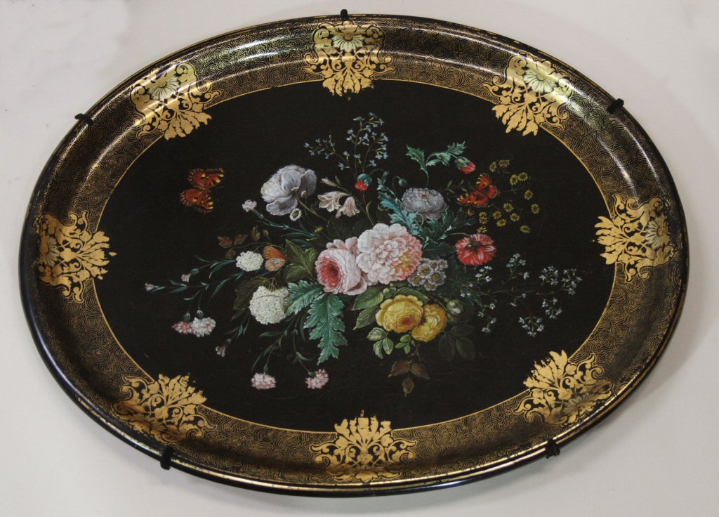of oval form, the centre decorated with flowers and butterflies, with gilt foliate border