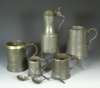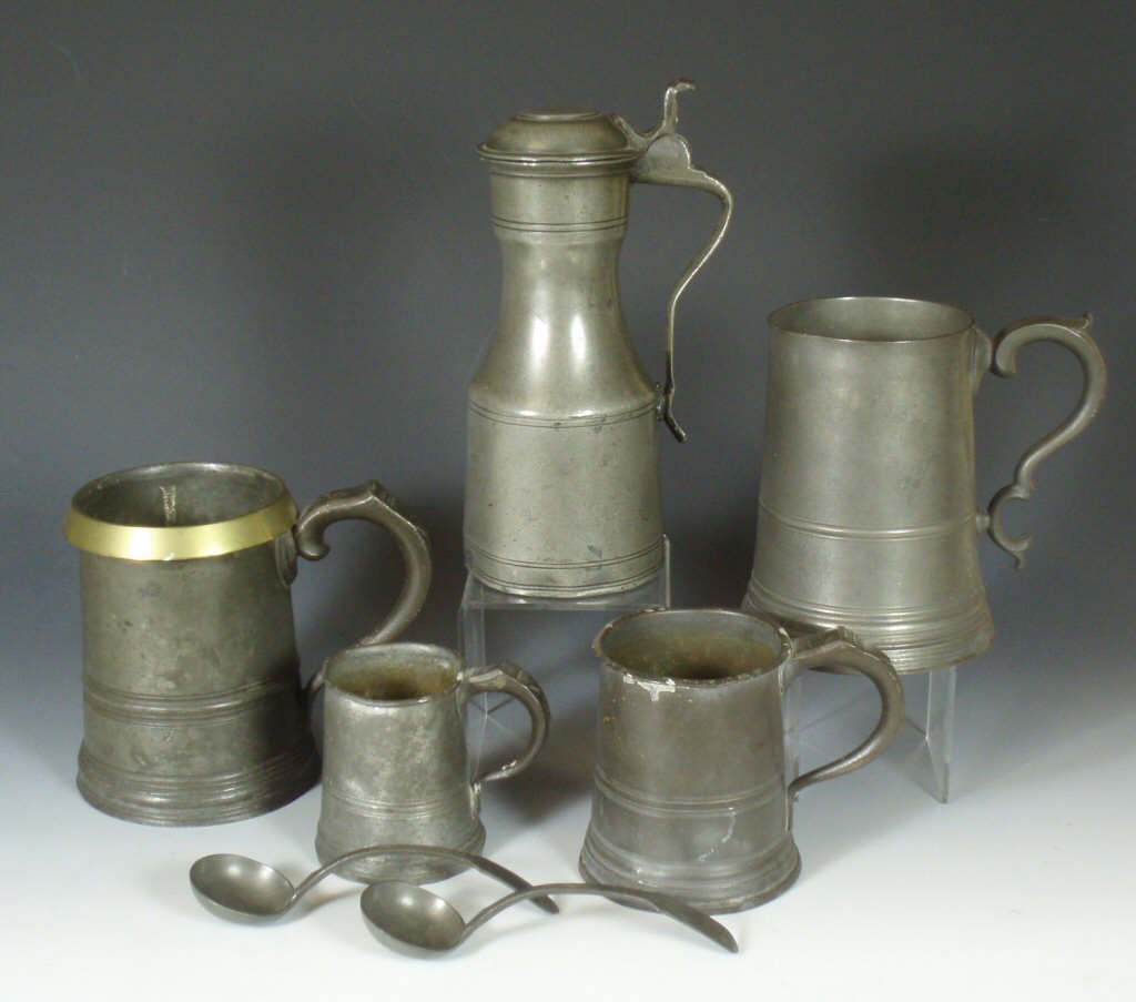 23cm high; a 19th century tankard with glass bottom and scroll handle, 15.5cm high; another tankard with brass rim and scroll handle, 15cm high; two graduated tankards by Yates & Birch, 11cm high and 9cm high; and two sauce spoons with marks, each 15.5cm long (7)
