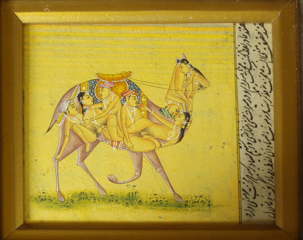 comprising: an erotic scene within a camel, 11.5cm x 15cm; an oval erotic scene in an interior, 6cm x 5cm; an erotic scene on a balcony, 14cm x 8.5cm; an erotic scene in a garden pavilion, 19cm x 10cm; an oval portrait of a gentleman, 6cm x 5cm; an oval portrait miniature of a gentleman, 6cm x 4.5cm; an oval portrait miniature of an Indian prince, 8cm x 6.5cm; an oval miniature of a bird, 14.5cm x 10cm; and two miniatures of Indian soldiers, each 18cm x 24cm (10) ALTERATION: Please Note that these are 20th century and not 19th century