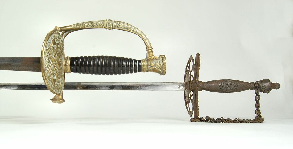 comprising: an 18th century French cut steel hilted sword,the hilt with chain link guard, the grip of faceted steel with raised studs, the shell guard pierced and studded, plain triangular blade in its original black leather scabbard; a gilt brass hilted court sword with cast decoration of trophy of arms, the hardwood grip carved into spiral, with triangular double edge blade; another court sword with cast hilt and with a double edged blade with Islamic inscriptions; an 18th century small sword with a cast gilt brass hilt and slender double edged blade; an 18th century British light cavalry troopers sword circa 1796, the stirrup hilt with centre lobe, plain wooden grip, curved single edged blade signed 'Wooley'; a foot artillery private's hanger with cast brass hilt and curved single edged blade dated on the back '1834'; an 18th century light dragoon troopers hanger with cast brass two bar hilt with curved single edge blade with single narrow fuller on the back edge; and a 19th century silver mounted Turkish yataghan, the grip of traditional form with hardwood half round slabs and with silver band over the grip, the inward curving single edge blade with Islamic inscription in original embossed leather scabbard with silver ringed locket and silver chape (8)