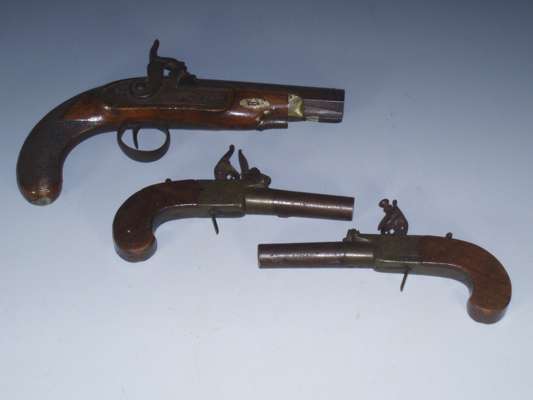 with damaged cock and frizen, the brass actions signed, each 17cm long; and a mid 19th century percussion carriage pistol with octagonal barrel, signed 'Dungannon, Kilpatrick', 24cm long (3)