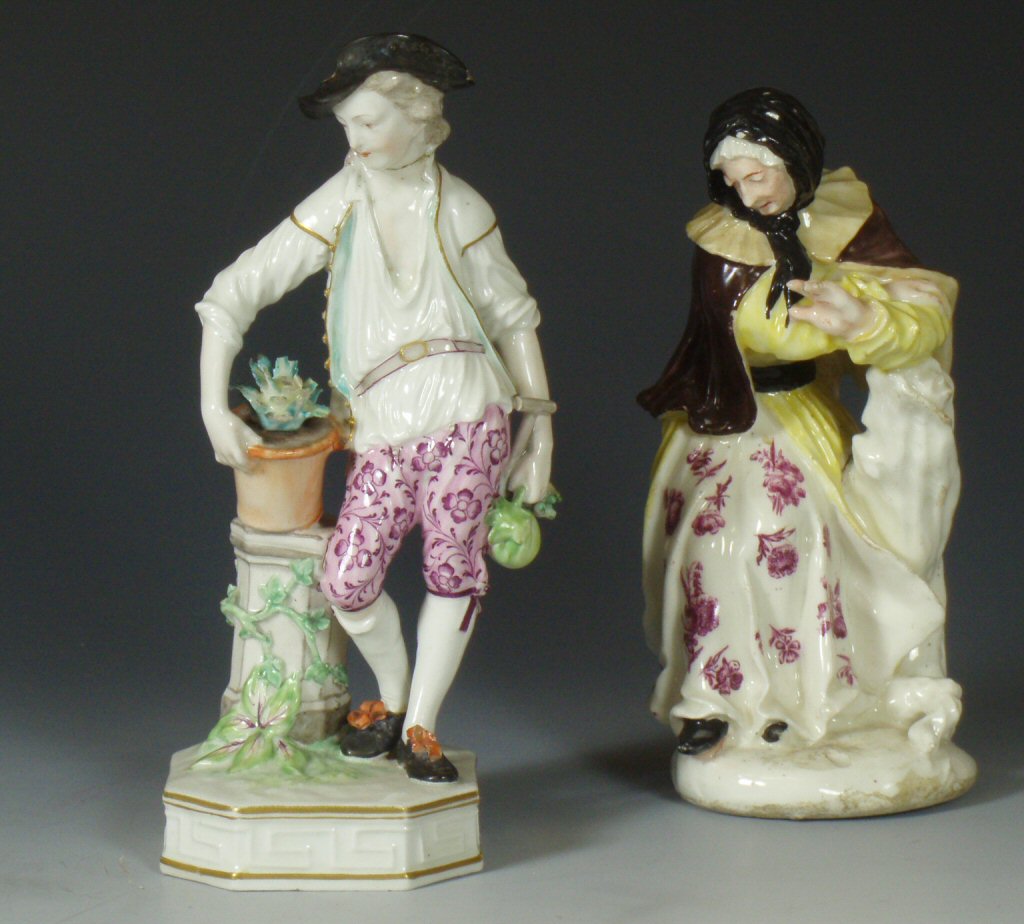 with key pattern plinth base, painted in colours, 17cm high; and a Derby figure of an elderly lady wearing a cape, painted in colours, 16cm high (2)