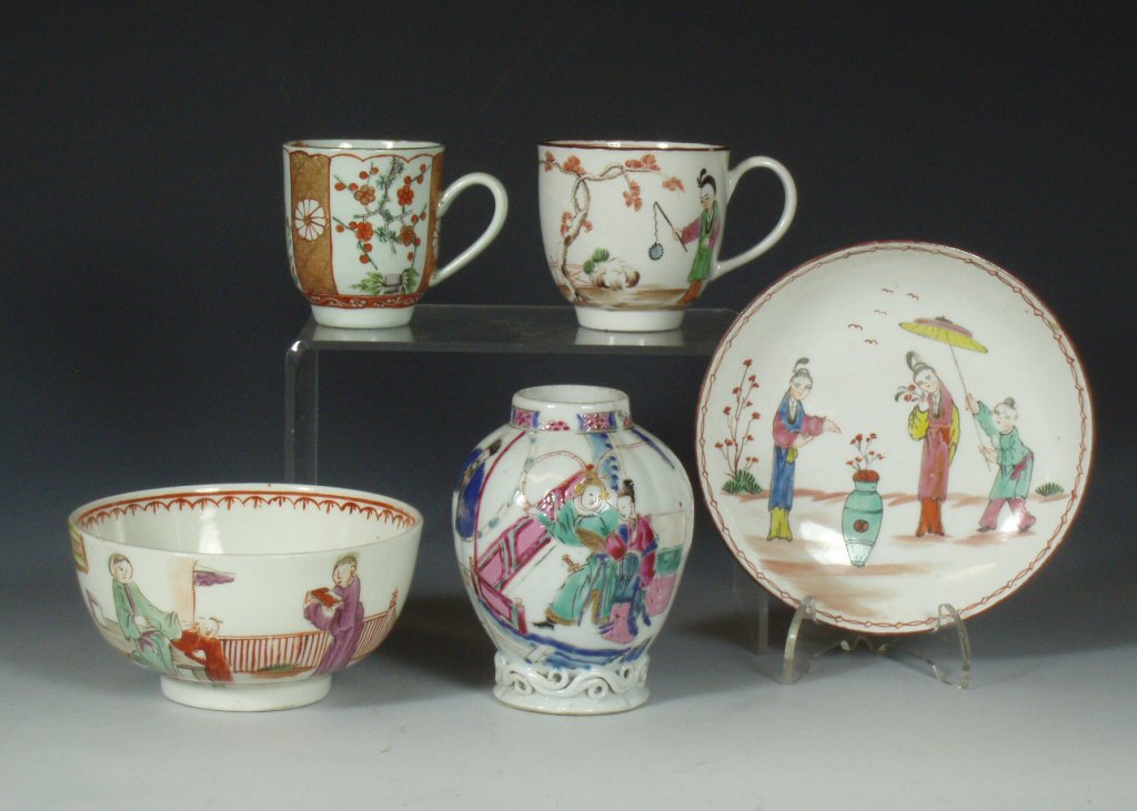 decorated with Mandarin figures on a terrace, 10.5cm diameter; a similar Worcester saucer dish, 12.5cm diameter; a Chinese polychrome tea caddy', 9cm high; a Barr Period Worcester cup, 1790's, painted with Chinese figures in polychrome enamels with incised B mark, 6cm high; and a Worcester Japan pattern cup, 6cm high (5)