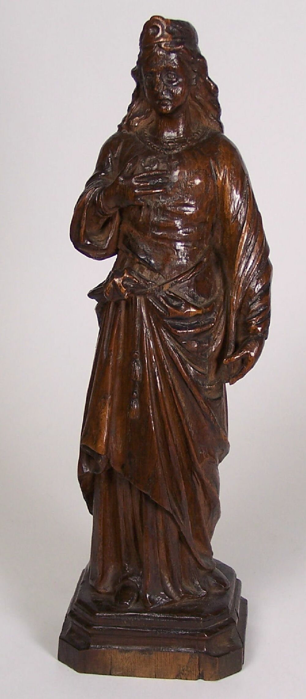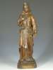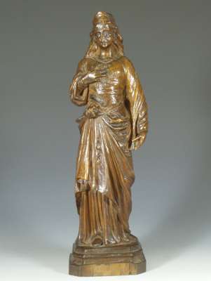 wearing a head-dress and necklace with key and crucifix pendants, her gown with a tasselled belt and formerly having a sash, on a moulded and canted rectangular plinth base