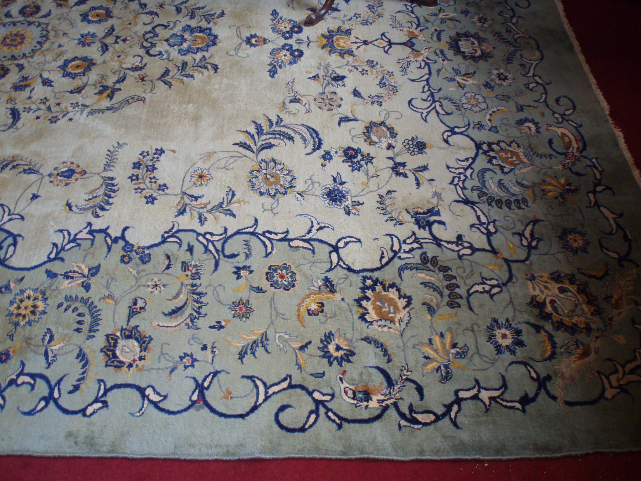 mid 20th century, the eau de nil field with central foliate vine medallion with light blue centre, within shaped green palmette, scrolling vine and bird border