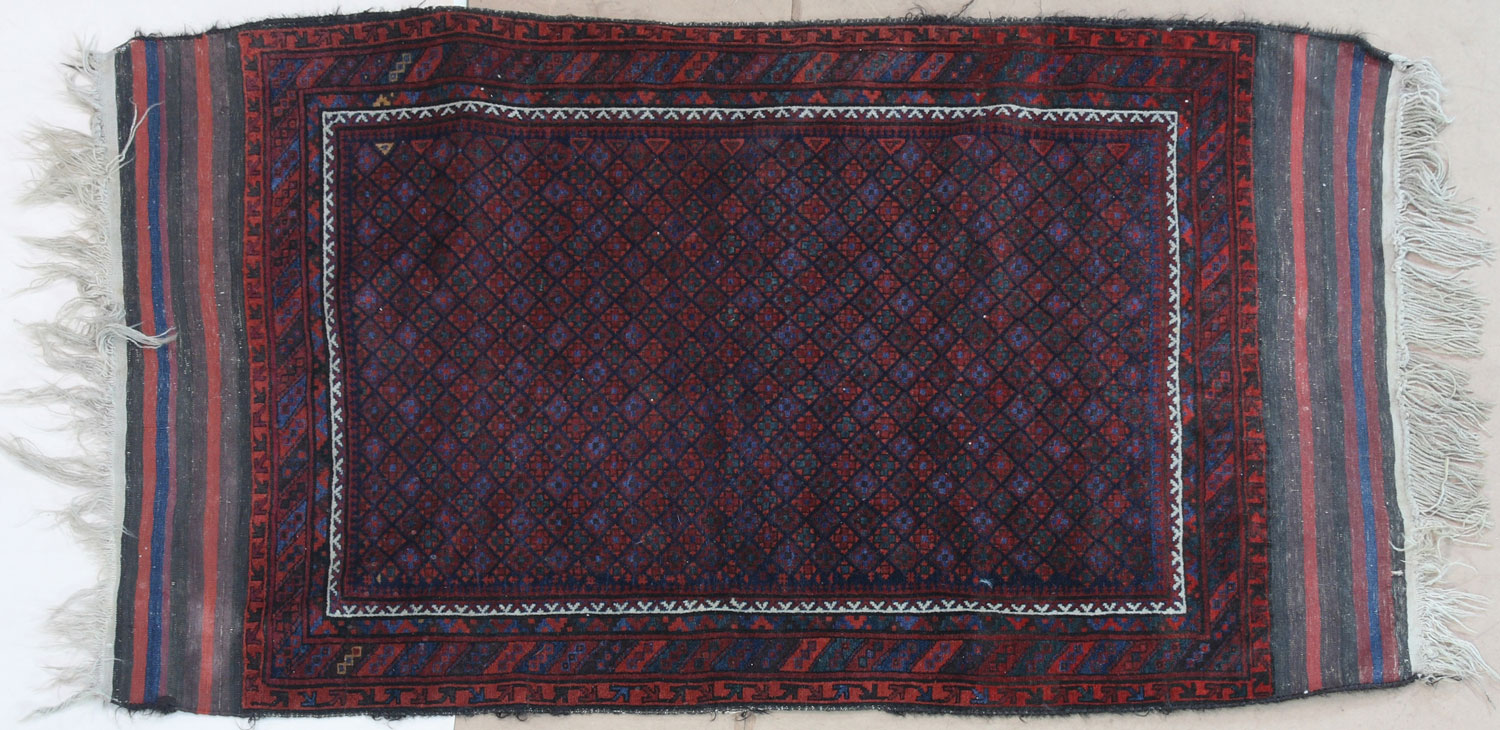 the wine field with an all-over mulit-coloured herati design within a main border of cruciform filed octagons and yellow foliate bands, striped kelim ends; together with a Beluch rug, the rust and indigo field with diagonal bands of mulit-coloured flowerheads, within a main slant-stripe border and striped kelim ends (2)