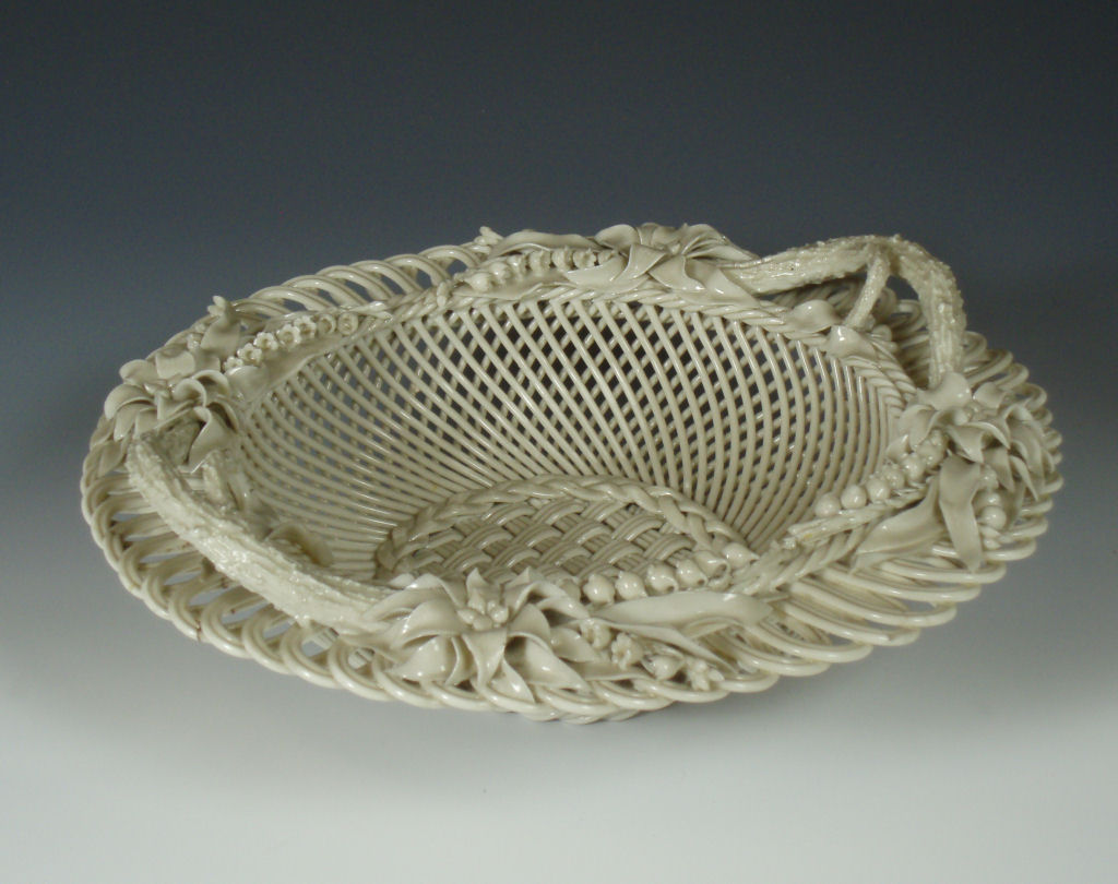 the rim with applied flowers, the well with wickerwork pattern, impressed marks to base 'Belleek Co. Fermanagh'