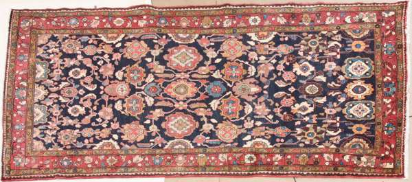 the deep indigo field with boldly drawn mulit-coloured rosettes linked by leafy vines, within a main madder palmette border between floral meanders