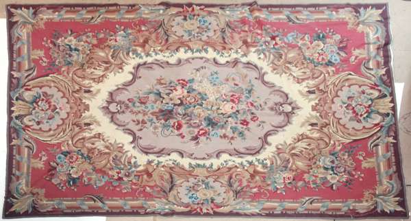 the central grey and ivory cameo shaped field with garlands of multi-colured summer flowers, within crimson spandrels and framed rocaille outer border
