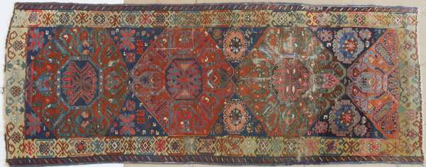 late 19th/early 20th century, the mid-blue field with three large cusped floral medallions and a halved medallion, within a main saffron crab rosette border between wave scroll outer guards, worn