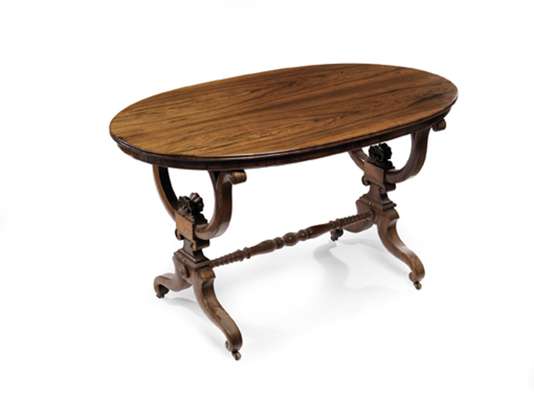 the top with a moulded edge, on double scroll supports with central shells, the downswept legs with brasss castors and joined by a turned pole stretcher