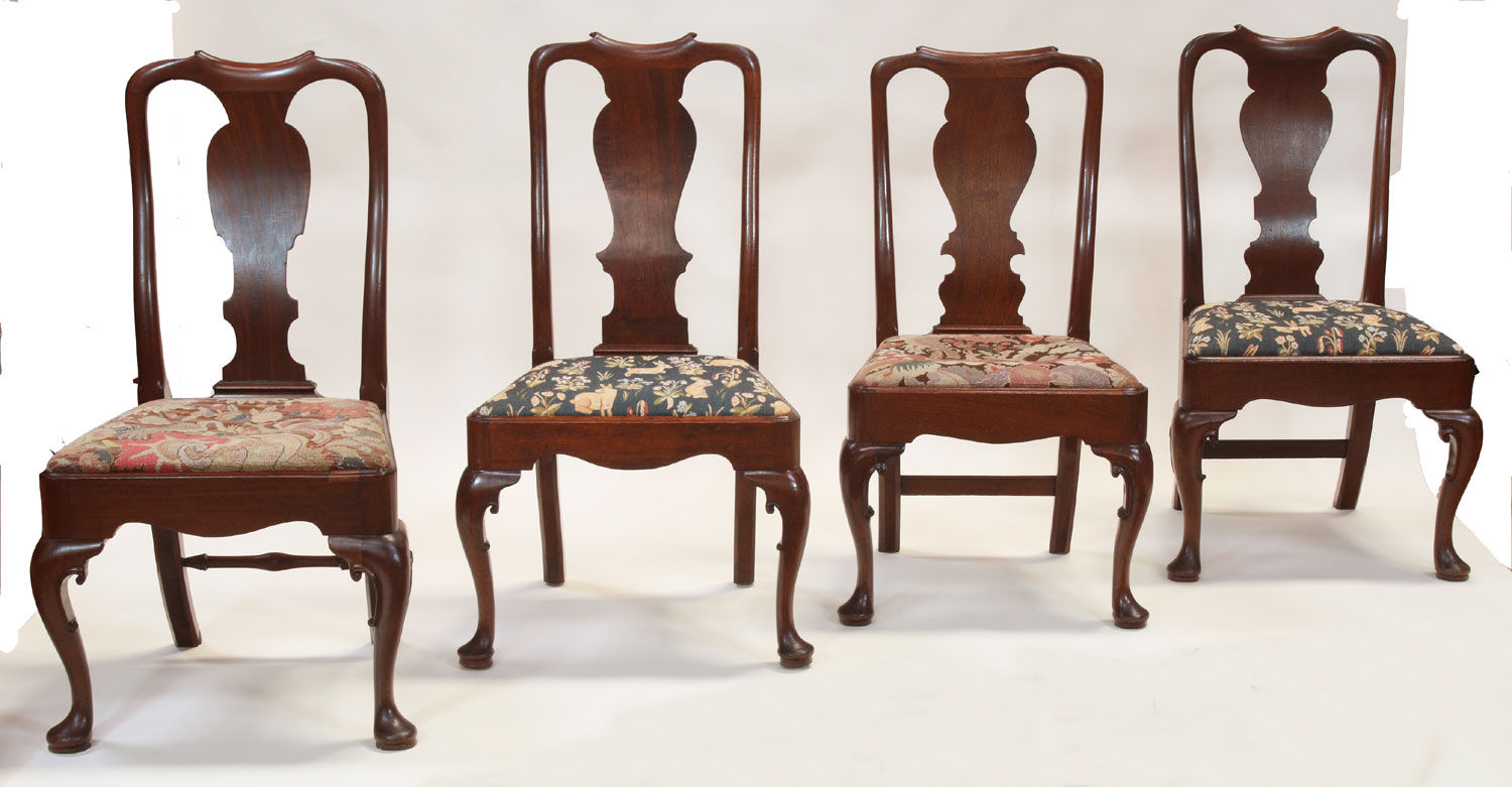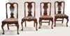 each with curved toprail over a vase shaped splat, with drop-in pad seat raised on cabriole legs terminating in pad feet (4)
