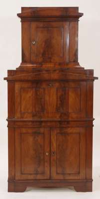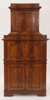 the frieze pediment over a panelled door, the base section of similar design with fall-flat over a further two doors enclosing shelves, raised on bracket feet