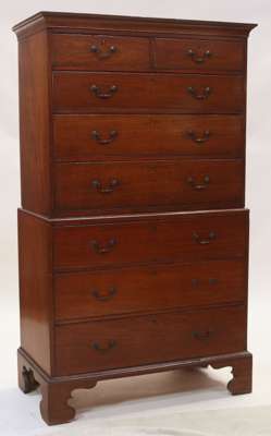 the projected moulded cornice over two short over six graduated long drawers raised on bracket feet