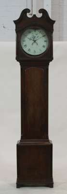 with thirty hour movement, the circular enamelled dial with roman and arabic numerals and calendar aperture, (maker's name indistinct), the swan neck pediment above a chamfered corner trunk, on bracket feet
