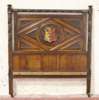 the multi-panelled headboard with a red and gilt coat of arms depicting a rampant lion and three fleur de lys, the footboard with a gilt on blue monogram enclosed within a leafy quatrefoil, below are five livenfold panels, the side rails with entwined guilloche