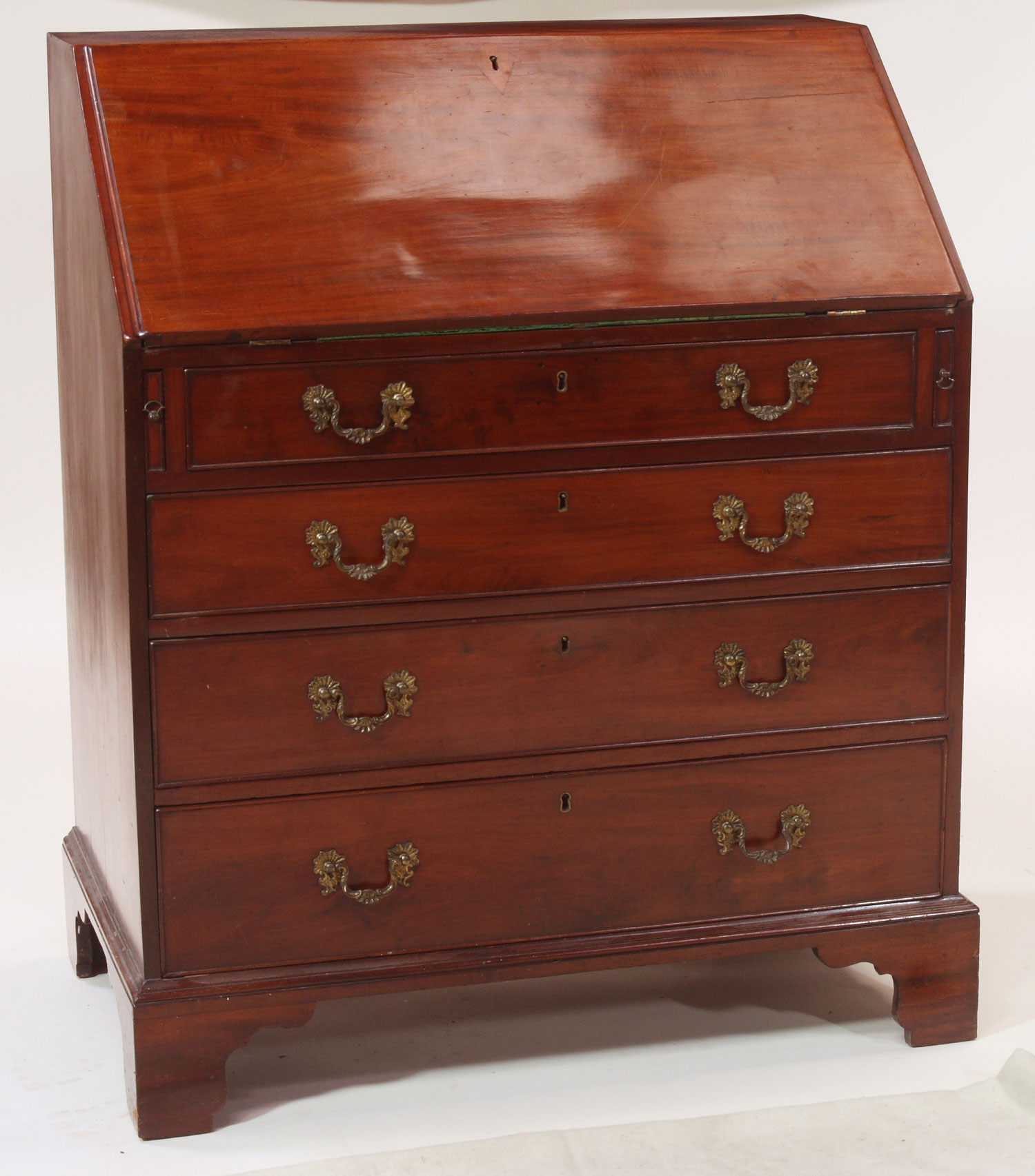 the moulded fall-flap enclosing skiver with boxwood strung fitted interior over four cock-beaded long drawers, raised on bracket feet