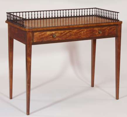 the baluster turned three quarter gallery over satinwood and mahogany crossbanded top, frieze drawer, raised on square tapering legs