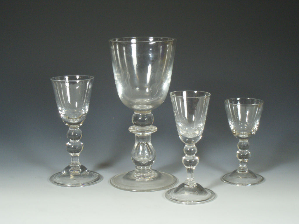 each with funnel bowl, knopped stem and conical foot comprising: eighteen graduated wine glasses and a large glass of similar design; two rummers, each with bucket bowl, annular knopped stem and plain foot; and five port glasses (26)