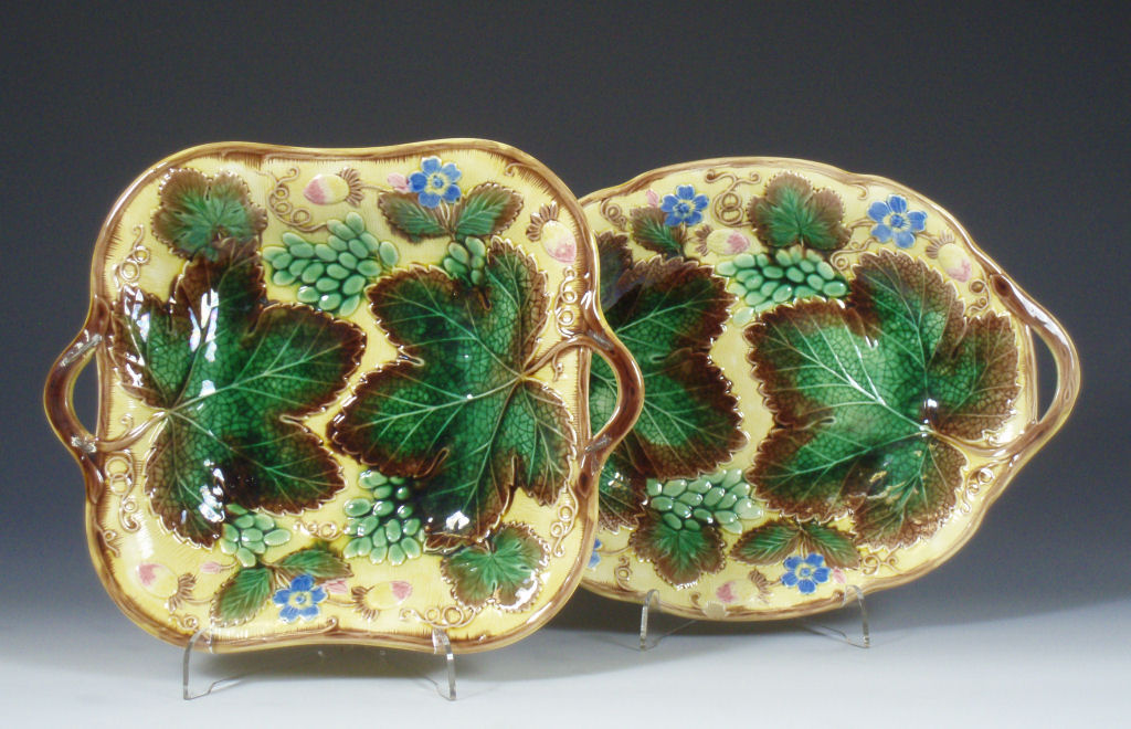with leaf and grape pattern in yellow, blue, pink and green glazes, with impressed marks, pattern number 10U29, comprising: twelve plates and four dishes of assorted shapes (16)