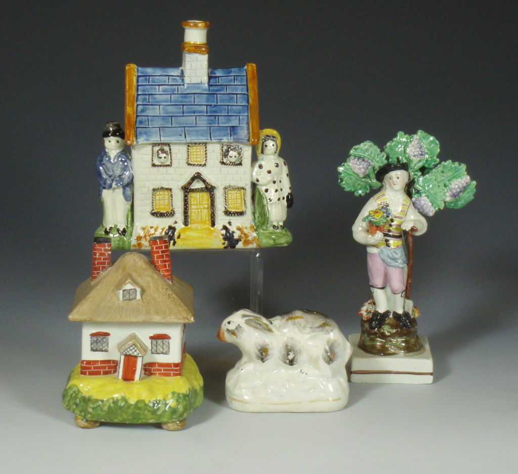 decorated on all sides, the house flanked by a man and a woman, 12cm high; a Staffordshire pastille burner house with two chimneys, 9cm high; a Staffordshire figure of a gardner holding a spade and a flowerpot in front of a tree, 12.5cm high; and a Staffordshire rabbit, 5cm high (4)