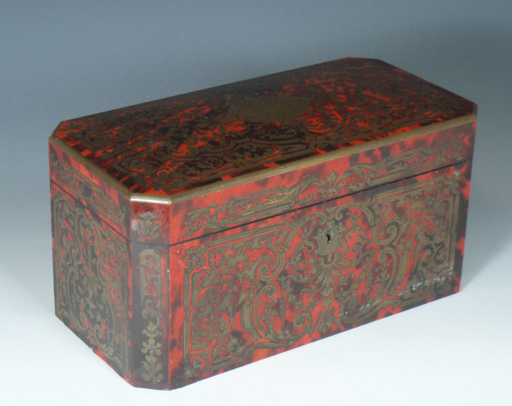 An early 19th century scarlet boulle work and brass inlaid tea caddy